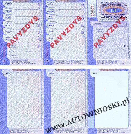 Litwa - dokument potwierdzający rejestracje w danym państwie. Dowód rejestracyjny jest dokumentem dopuszczającym dany pojazd do ruchu drogowego. Przedstawiony dokument stanowi tylko i wyłącznie wzór dokumentu wydawanaego w danym kraju.